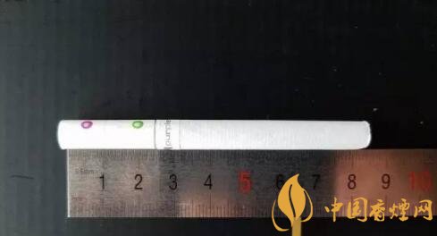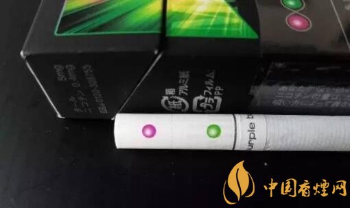 拿出一支香煙仔細端詳,煙支整體顏色很素雅,過濾嘴上的兩顆爆珠紫色的藍莓珠在靠尾端一點,綠色的薄荷珠在濾嘴的另一端,一排降焦線相當明顯,在不用強光看的情況下都清晰可見。