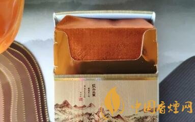 在煙盒處的腰間,一條金色的絲帶環(huán)繞整個煙盒。中央的水墨山水畫很是素雅,在畫中還有一段詩句,古香氣息彌漫。下半部的本公司提示不多贅述。