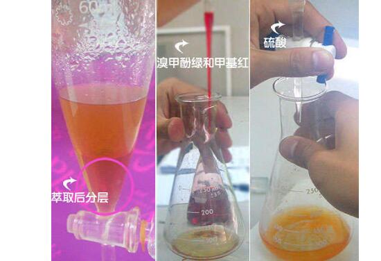 4,以三氯甲烷為萃取劑,為指示劑,用標(biāo)準(zhǔn)硫酸溶液直接滴定尼古丁的方法(操作及顏色變化見(jiàn)圖4)。