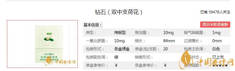 鉆石(雙中支荷花)定價(jià)為55元/包。作為鉆石的高檔中支煙,外觀方面非常成功,價(jià)格也不是很貴。