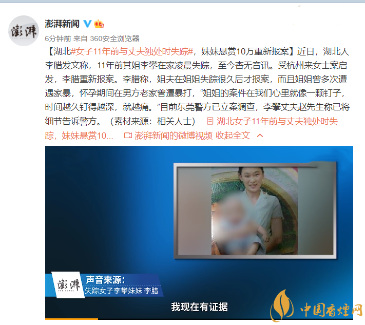 以上就是對湖北女子11年前與丈夫獨(dú)處時失蹤,妹妹重新報案的事件報道,具體事件發(fā)展還要等警方調(diào)查結(jié)果,后續(xù)發(fā)展我們將繼續(xù)跟進(jìn)。想了解更多時事熱點(diǎn),請關(guān)注香煙網(wǎng)!