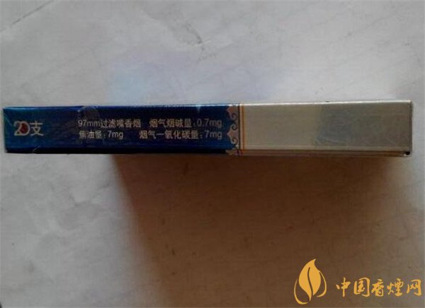 煙盒右側(cè)標(biāo)注著香煙的理化數(shù)值,標(biāo)注著過濾嘴香煙長97mm,0.7mg煙氣煙堿量,7mg焦油量,7mg煙氣一氧化碳量,印有主品牌單位名稱,數(shù)量指標(biāo)20支。