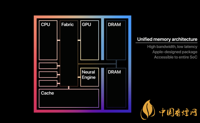 它與iPhone和iPad里面的蘋果芯片非常相似,只是功能更強(qiáng)大。它利用了蘋果公司的統(tǒng)一內(nèi)存架構(gòu)(UMA),這意味著全部內(nèi)存(DRAM)與需要訪問內(nèi)存的各種部件(比方說CPU、GPU、圖像處理器以及神經(jīng)引擎)都是在同一塊芯片上。其結(jié)果是,整塊芯片都可以訪問數(shù)據(jù),而不需要在不同部件之間復(fù)制數(shù)據(jù),也不需要進(jìn)行互連。對內(nèi)存的訪問有著極低的時延與極高的帶寬。其結(jié)果是更低功耗、更好性能。