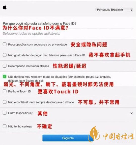 它詢問(wèn)了用戶對(duì)Face ID的滿意度,如果不滿意的話,問(wèn)卷里會(huì)給出幾個(gè)選項(xiàng),要求用戶選擇原因。