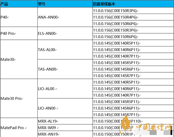全網(wǎng)通(5G雙卡)P40 、 全網(wǎng)通版P40 Pro、Mate30、Mate30(5G) 、Mate30 Pro、Mate30 Pro(5G),型號清單為ANA-AN00、ELS-AN00、TAS-AL00、TAS-AN00、LIO-AL00、LIO-AN00 。