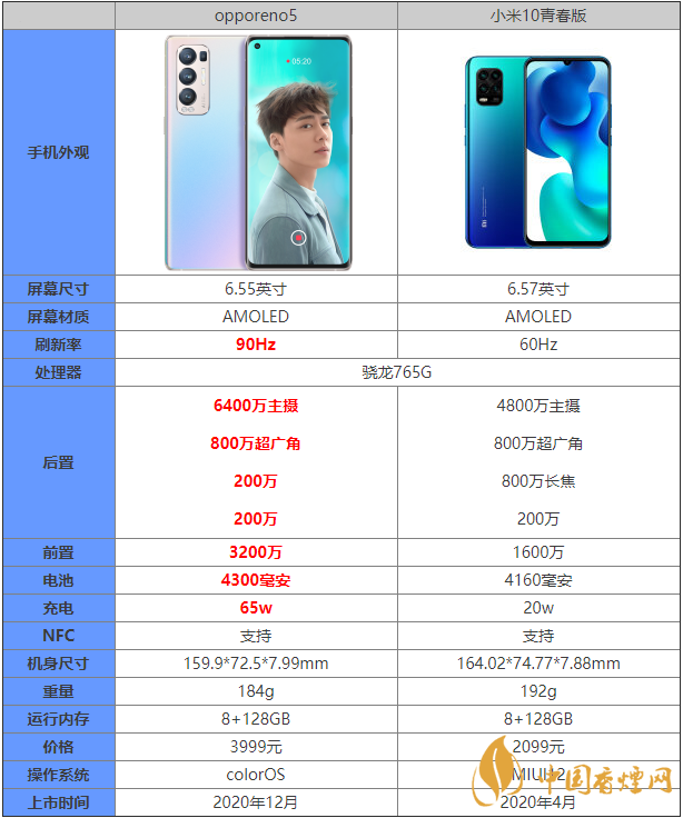 opporeno5和小米10青春版都是搭載驍龍765G的手機(jī),那么這兩款手機(jī)的之間的區(qū)別是什么呢?哪款手機(jī)更值得入手?接下來香煙網(wǎng)小編為大家?guī)碜钚碌膐pporeno5和小米10青春版參數(shù)對(duì)比,感興趣的朋友快來看看吧。