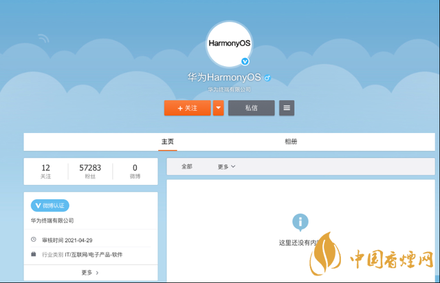 微博頁面顯示,“華為HarmonyOS”微博認證為華為終端有限公司,審核時間為4月29日。雖然目前該官方微博還未發(fā)布任何動態(tài),但粉絲量已經(jīng)接近6萬。