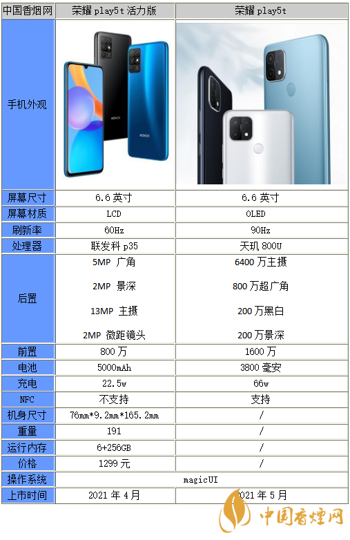 以上就是小編收集到的榮耀play5和榮耀play5t活力版區(qū)別在哪-參數性能分析的相關內容,以上內容均來源于網絡,僅供參考,一切以實際為準,更多最新數碼資訊請關注香煙網。