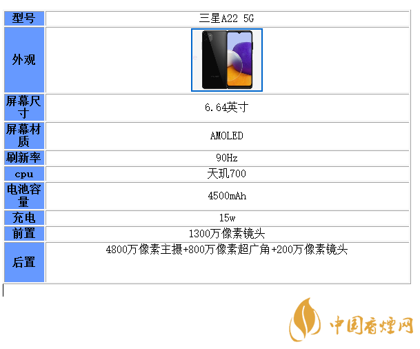 以上就是小編收集到的三星A22 5G參數(shù)配置詳情-三星A22 5G性能分析的相關(guān)內(nèi)容,以上內(nèi)容均來源于網(wǎng)絡(luò),僅供參考,一切以實(shí)際為準(zhǔn),更多最新數(shù)碼資訊請(qǐng)關(guān)注香煙網(wǎng)。