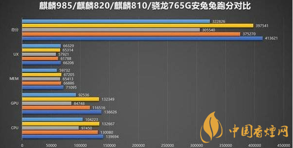 同時從麒麟985/麒麟820/麒麟810/驍龍765G安兔兔成績橫向?qū)Ρ葓D來看