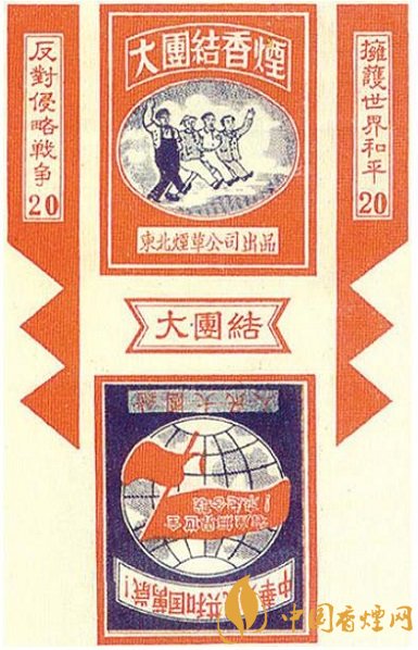 東北煙草公司出品的“大團(tuán)結(jié)”煙標(biāo),主版圖案為4個男性人物攜手并進(jìn)的場景,側(cè)標(biāo)位置分別印有“擁護(hù)世界和平”“反對侵略戰(zhàn)爭”字樣,副版圖案為地球上飄揚(yáng)著一面上書“全世界無產(chǎn)者聯(lián)合起來”字樣的旗幟,在其上下則分別印有“中華人民共和國萬歲”“人民大團(tuán)結(jié)”字樣。