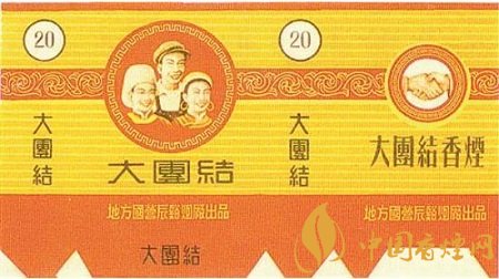 這一時期出品的“大團(tuán)結(jié)”煙標(biāo)也有很多,如太原煙草廠出品的“大團(tuán)結(jié)”煙標(biāo),主版于花卉圓圖內(nèi)印有“大團(tuán)結(jié)”字樣;地方國營辰谿煙廠出品的“大團(tuán)結(jié)”煙標(biāo),主版圖案為兩名女性和一名男性的人物形象,副版是兩只手緊緊握在一起的畫面。