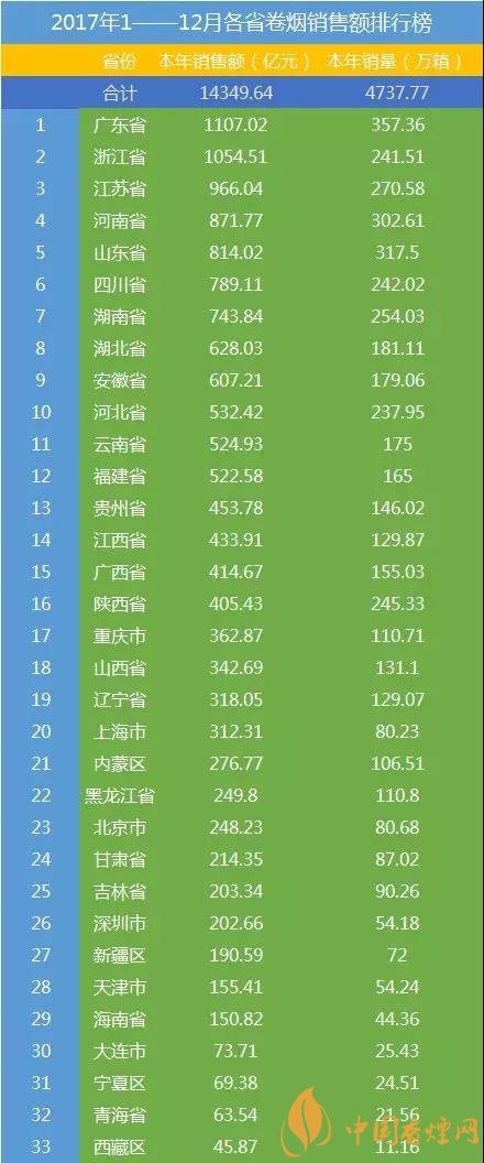 轉(zhuǎn)眼2018已經(jīng)到來(lái),上次小編寫(xiě)到2017年商業(yè)品牌銷(xiāo)量的前15名,今天就來(lái)和大家說(shuō)說(shuō)各地卷煙銷(xiāo)量情況。在剛剛過(guò)去的2017這一年里,你為家鄉(xiāng)卷煙銷(xiāo)量都貢獻(xiàn)了多少呢?最新中國(guó)香煙銷(xiāo)量排行榜前10名出爐!下面香煙網(wǎng)小編為大家整理介紹。