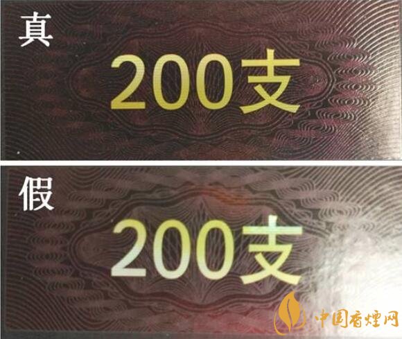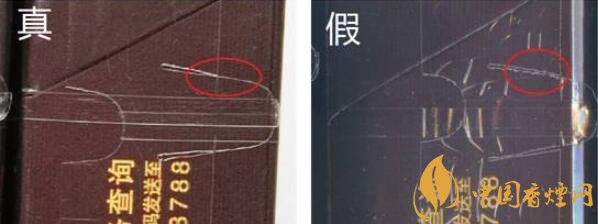真煙條盒側(cè)面,小盒頂部均采用與人民幣相同效果的鈔線防偽技術(shù),由無(wú)數(shù)根交叉防偽細(xì)線編織在一起,油墨厚,交叉線條根根清晰完整無(wú)缺,線條錯(cuò)中有序,立體感強(qiáng)。假煙采用掃描復(fù)制技術(shù),其交叉線條清晰度差,無(wú)立體感,與真品防偽技術(shù)存在明顯差異。