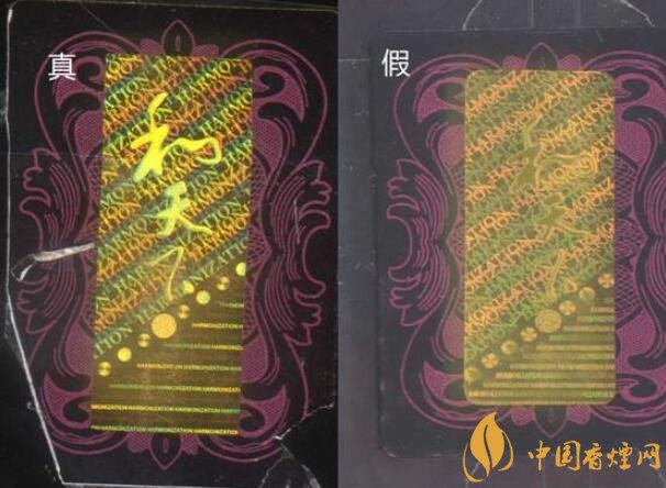 假煙仿造粗糙,字體有脫色殘缺現(xiàn)象,切換不同角度無(wú)顏色變化,與真品激光全息防偽技術(shù)存在明顯差異。