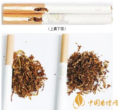 真煙煙支采用單一醋纖濾嘴,長(zhǎng)度為24mm,煙絲切絲寬度均勻,煙絲疏松、光澤油潤(rùn)性好、呈檸檬黃色、含碎末少,煙絲結(jié)構(gòu)為葉絲、膨脹葉絲、膨脹梗絲;假煙煙支過濾嘴較短,長(zhǎng)度約為20mm,制絲工藝粗糙,色澤發(fā)暗無光澤、煙絲中含碎末較多,大量梗絲未經(jīng)過膨脹處理,一般無膨脹葉絲,與真品特征存在明顯差異。