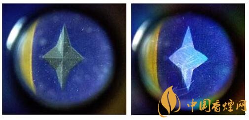 (3)真品卷煙商標(biāo)LOGO處“星”,側(cè)光觀察立體感強(qiáng),中間凸邊緣平,呈錐形,棱角明顯。