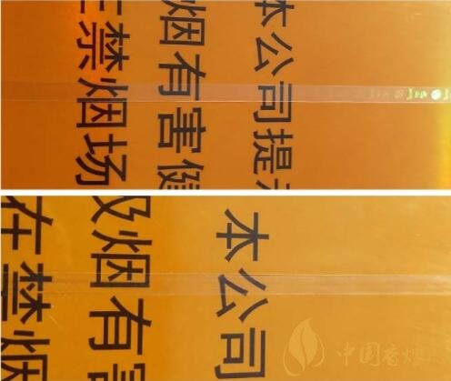 該款假冒卷煙透明紙燙封處“魚鱗狀”不規(guī)則氣泡較多而且水汽痕跡明顯;燙封線條呈現(xiàn)弧線。(圖4上真下假)