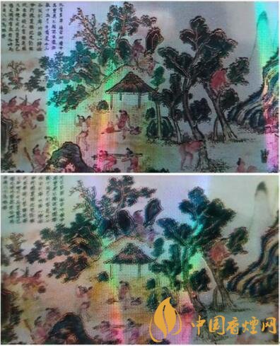 真品卷煙“采香圖”圖案清晰,樹木燙金線明亮。商標(biāo)紙底紋為點(diǎn)狀,觀察呈現(xiàn)網(wǎng)格狀。該款假冒卷煙“采香圖”圖案模糊,樹木燙金線暗淡,商標(biāo)紙底紋無網(wǎng)格狀,呈現(xiàn)菱形圖案。