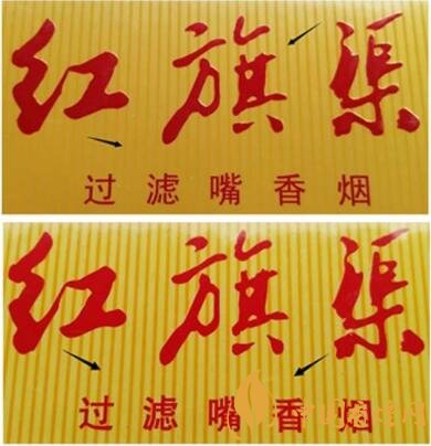 該款假冒卷煙“紅旗渠”字體未做“起凸”處理,字體平整,無立體感。(圖1上真下假)