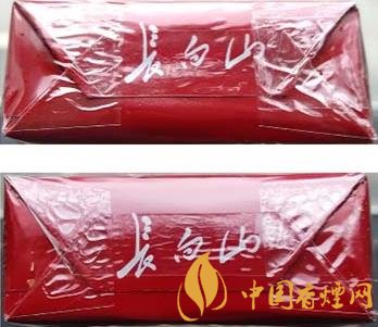 真品卷煙:1.拉線頭形狀為飽滿的半橢圓形。2.透明紙上烙鐵痕跡寬且明顯。3.商標(biāo)紙超線印刷長(zhǎng)白山圖案和logo圖案,側(cè)光觀察明亮、清晰。