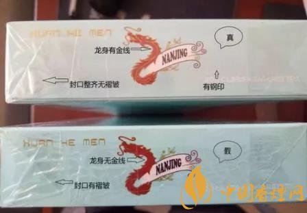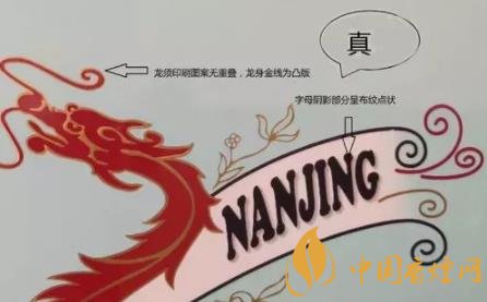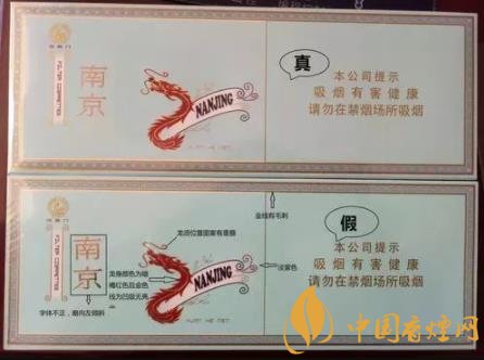 看條盒顏色,真煙為淡藍(lán)色,顏色柔和純正;假煙為淺藍(lán)色,視覺(jué)上顏色不是自然色。看條盒圖標(biāo),真煙“南京”二字字體端正清晰,龍須印刷圖案無(wú)重疊,龍身金線為凸版,條盒金邊無(wú)毛刺;假煙“南京”二字字體向左微傾,龍須有疊痕錯(cuò)層,龍身顏色為褐紅色、金線為凹版,條盒金邊有毛刺。