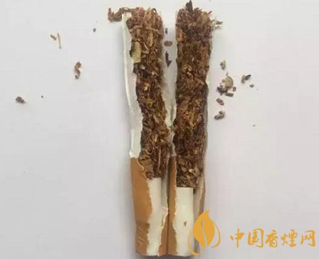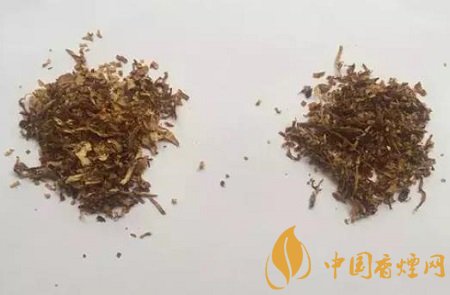 真品卷煙煙絲呈金黃色、絲條狀,香氣綿柔;假煙煙絲呈棕黑色,含末量大,香精氣味濃烈。