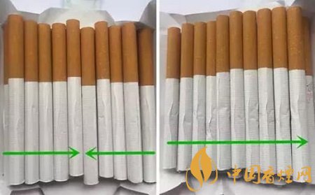 真品卷煙底部有兩個規(guī)則對稱的等腰三角形;假煙底部的兩個三角形不規(guī)則且不對稱。