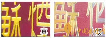 真煙:燙金字體線(xiàn)條清晰、不漏金,金色部分成色純正。假煙:燙金字體線(xiàn)條不清晰,有漏金現(xiàn)象,金色部分成色暗淡。