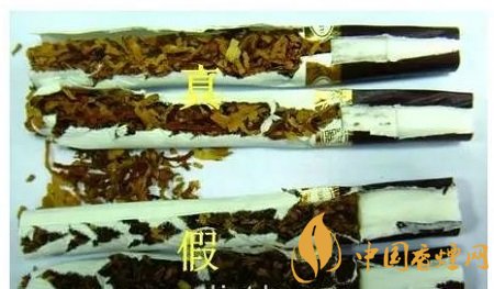 如圖所示:真品煙支采用二段式生物降焦濾嘴,煙絲顏色為金黃色,切絲寬度均勻一致;假煙多采用單一的普通濾嘴,煙絲顏色多為褐色。(上真下假)