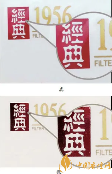 真煙條盒上的“經(jīng)典”二字筆劃清晰、有立體感;假煙條盒上的“經(jīng)典”二字筆劃粗糙、字跡模糊。