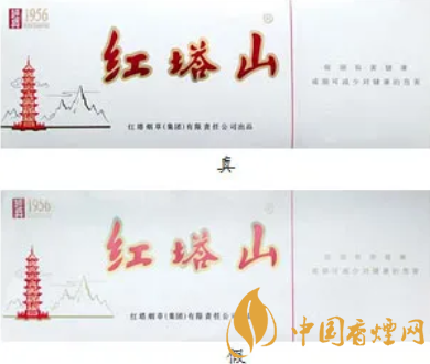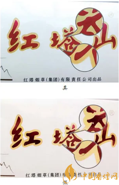 真煙條盒上“紅塔山”三個字的顏色為暗紅色;假煙條盒上“紅塔山”三個字的顏色為鮮紅色。