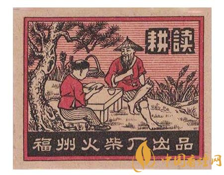 而福州火柴廠出品于1954年的“耕讀”(圖4)火花,則表現(xiàn)了一位頭戴斗笠的老農(nóng)在春耕間隙,翹著二郎腿坐在田邊青松下的石頭上,胳膊肘斜放于在石桌,面帶微笑,抽著旱煙陪伴孫兒讀書的場景。再看老農(nóng)身后的簍子,以及桌上的碗筷,似乎是描寫這個老農(nóng)在吃完孫子給送的飯后,不忘“耕讀傳家”祖訓(xùn),利用吃飯休息間隙,輔導(dǎo)孫子多學(xué)點知識。