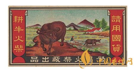 上世紀30年代,啟昌火柴廠出品的“耕牛”(圖1)火花,就描繪了一幅美麗的山村春耕圖:在數(shù)棵綠油油的樹木點綴下,幾戶農(nóng)家散落分布于山腳前的農(nóng)田里,一位頭戴斗笠的農(nóng)夫正扶犁驅(qū)牛耕田,近處則是一頭碩大的水牛目視前方的形象。