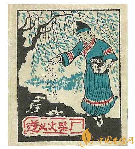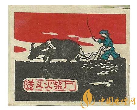 國榮火柴廠出品于同期的“大地牌”(圖3)火花,在朝霞滿天間有白云,以及數(shù)座民居背景的映襯下,突出了一名頭戴斗笠的農(nóng)夫,一手扶犁一手驅(qū)牛辛勤翻耕農(nóng)田的場面。