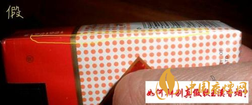 5這個圖片看拉線和頂部包裝處,真煙拉線有均勻的膠痕氣泡,假的平滑光潔,頂部口處,里面金色的包裝比外皮要高出一點(diǎn),假的是一齊的。
