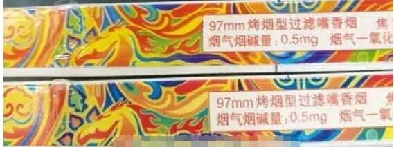 真煙藍色下邊是過渡的淡藍色,假煙無過渡色直接變成綠色。真煙中間為藍色,假煙全都是綠色。圖右側四個標注處相同,真煙為藍色的三個圓珠,假煙為綠色的三個圓珠。