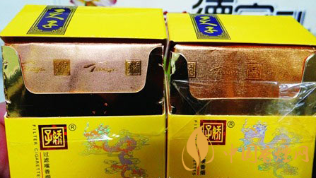 小盒商標(biāo)印刷工藝差異對(duì)比:真品小盒正面套印定位燙金“飛龍”圖案鱗片清晰,從頭至尾都能看到定位燙金工藝,紅色貫穿整個(gè)龍身,“鱗片”是雪里透紅,栩栩如生;假煙套印定位燙金仿制較差,鱗片無法達(dá)到真品的印刷工藝水平,印刷工藝與真品商標(biāo)圖案差異明顯。