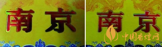 小盒商標(biāo)紙印刷工藝差異比對(duì):真品卷煙小盒商標(biāo)紙“南京”字體印刷由無(wú)數(shù)個(gè)相等小圓點(diǎn)組合而成且立體感強(qiáng),印刷工藝水平技術(shù)含量高,不易被仿制印刷;假煙小盒商標(biāo)紙“南京”字體采用普通仿制套印燙金工藝,字體沒(méi)有立體感和線(xiàn)條層次感,套印燙金工藝粗糙且邊緣有毛渣,與真品印刷工藝差異明顯。