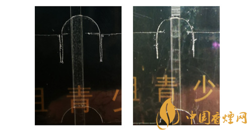 真品卷煙:條盒兩端透明紙上隱約可見卷煙包裝機烙鐵留下的燙封痕跡;底部透明中間位置紙收縮平整、緊實,兩側(cè)透明紙收縮自然;鋼印隱約可見力度大小不同,不清晰。