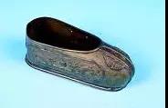 這款造型奇特的工藝煙灰缸來自以色列,為金屬質(zhì)地,外層漆金。整體造型為以色列特有的翹頭鞋,鞋跟處伸出一截短短的煙槽,鞋口則有陰刻的“JERUSALEM”(耶路撒冷)字樣;鞋身用簡(jiǎn)單的黑、紅、黃、白勾勒了具有明顯地域色彩的花紋,如回首的駱駝、椰樹、城墻等。整件作品的造型和色彩都帶有濃郁的中東風(fēng)情,高檔煙灰缸圖片十分別致。